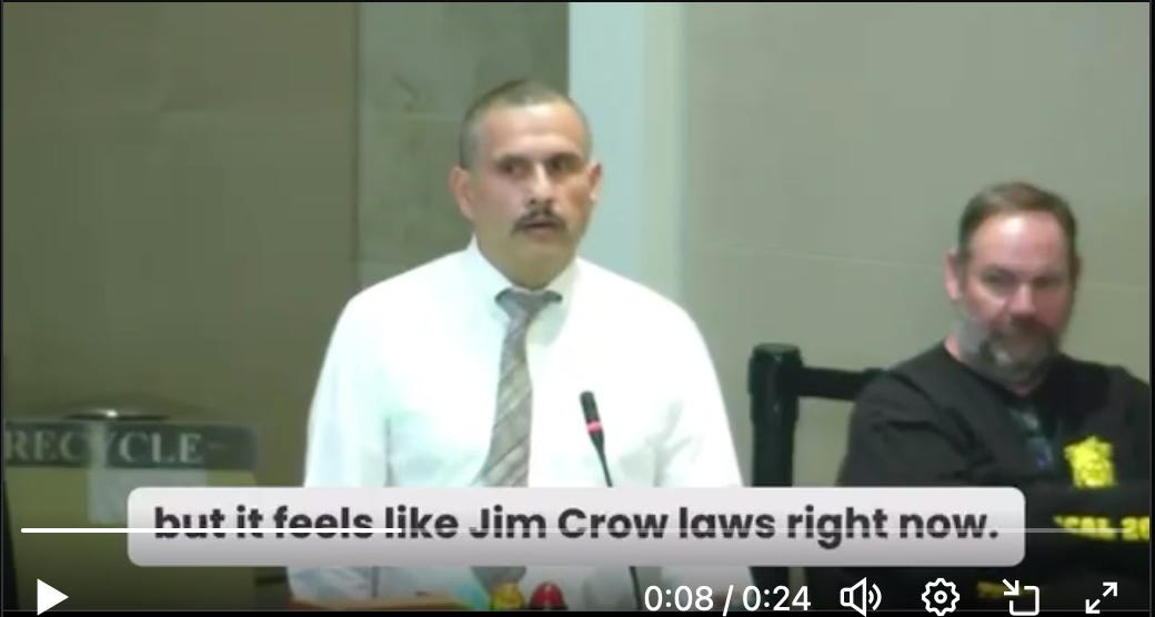 Antonio Gallo, California faculty of Chicano Studies. I wasn’t around during Jim Crow laws, but it feels like Jim Crow laws right now. The fact that you are separating individuals right now from restrooms and you’re using safety as an issue. That was the same used during Jim Crow laws. This is the CSU, this is what you all have created, but that’s not what I came here to talk about. I want to talk about SB98.